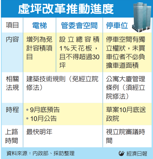 電梯免計容積、管委會空間都只需要修正「建築技術規則」,無須送立法院審議,腳步會較快,內政部預計9月底預告、10月完成公告,明年有機會上路。